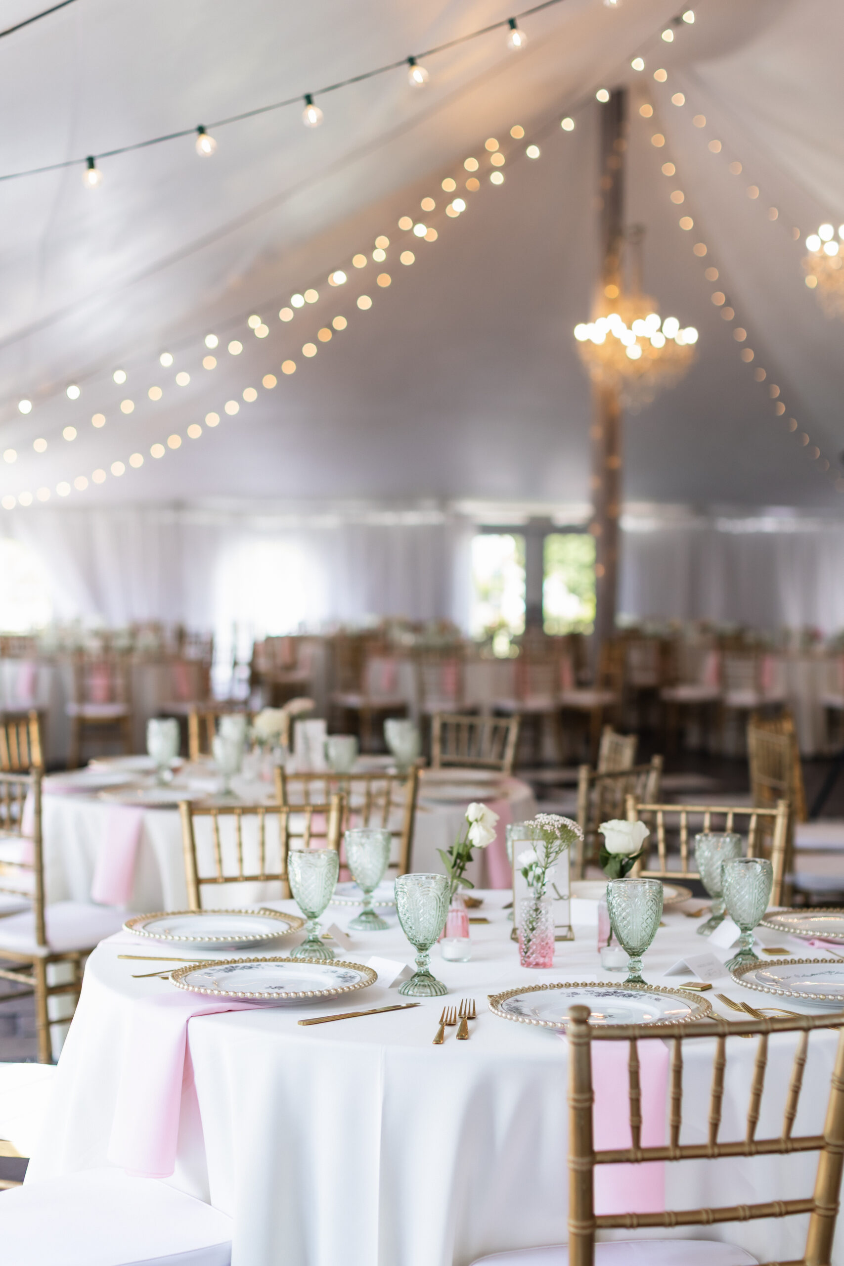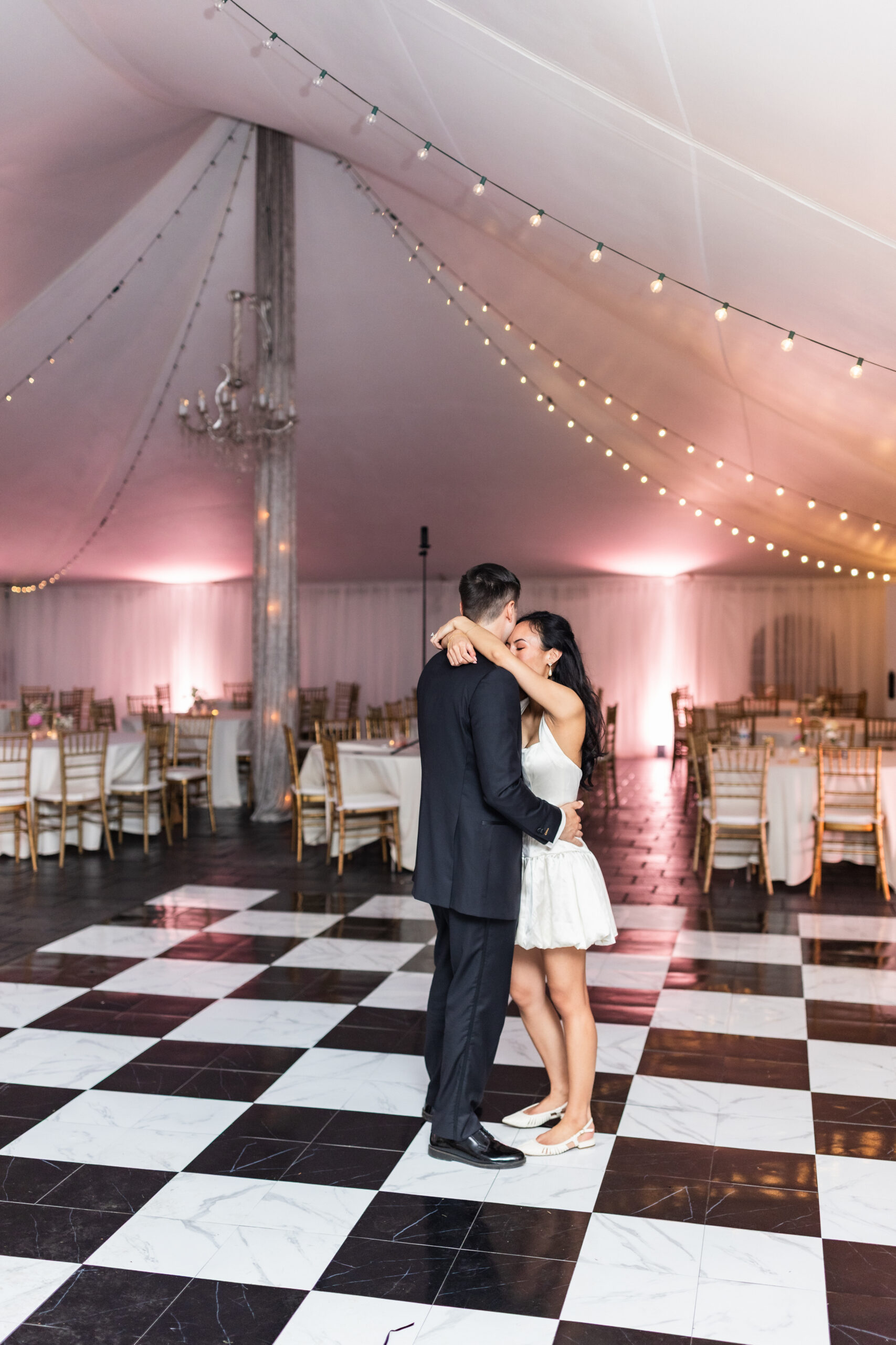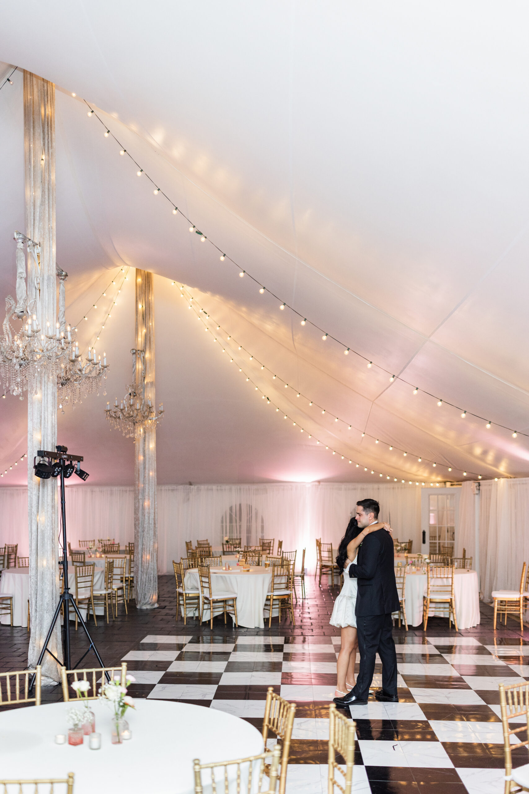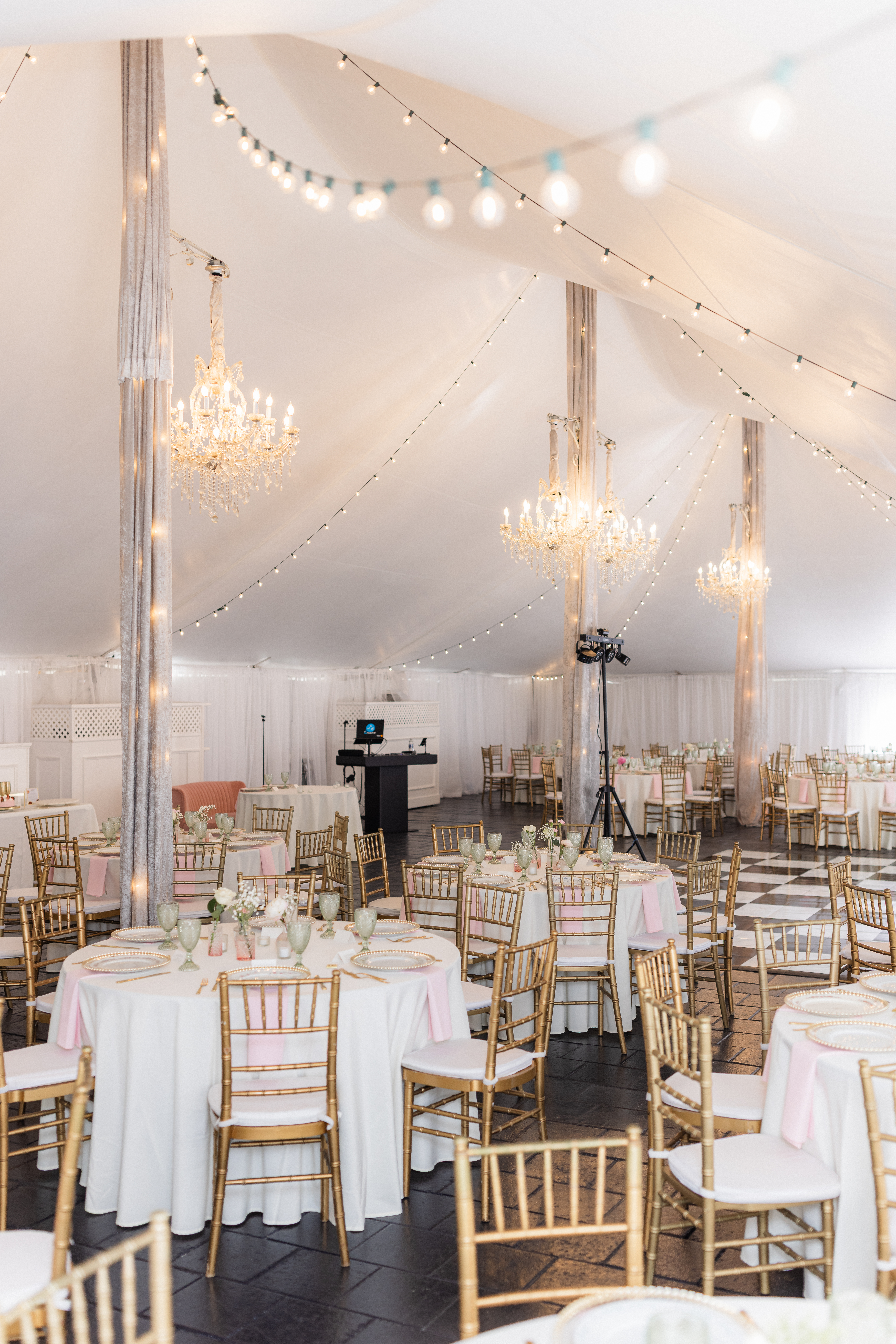 The reception is held in a climate-controlled luxury tent decorated with chandeliers, a checkered dance floor, chiavari chairs, french doors, and uplighting. There is so much the space has to offer and your guests will be ready to celebrate!