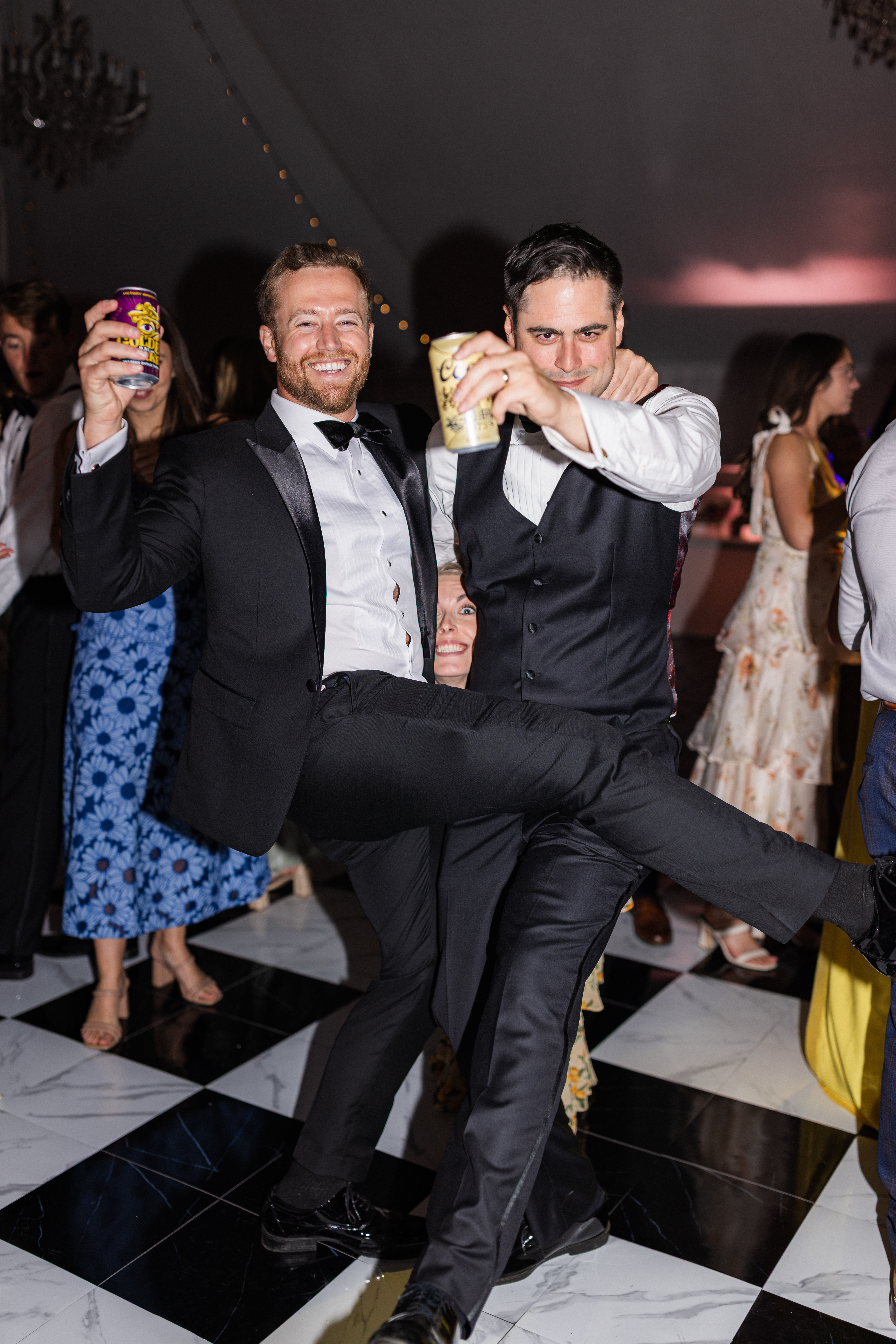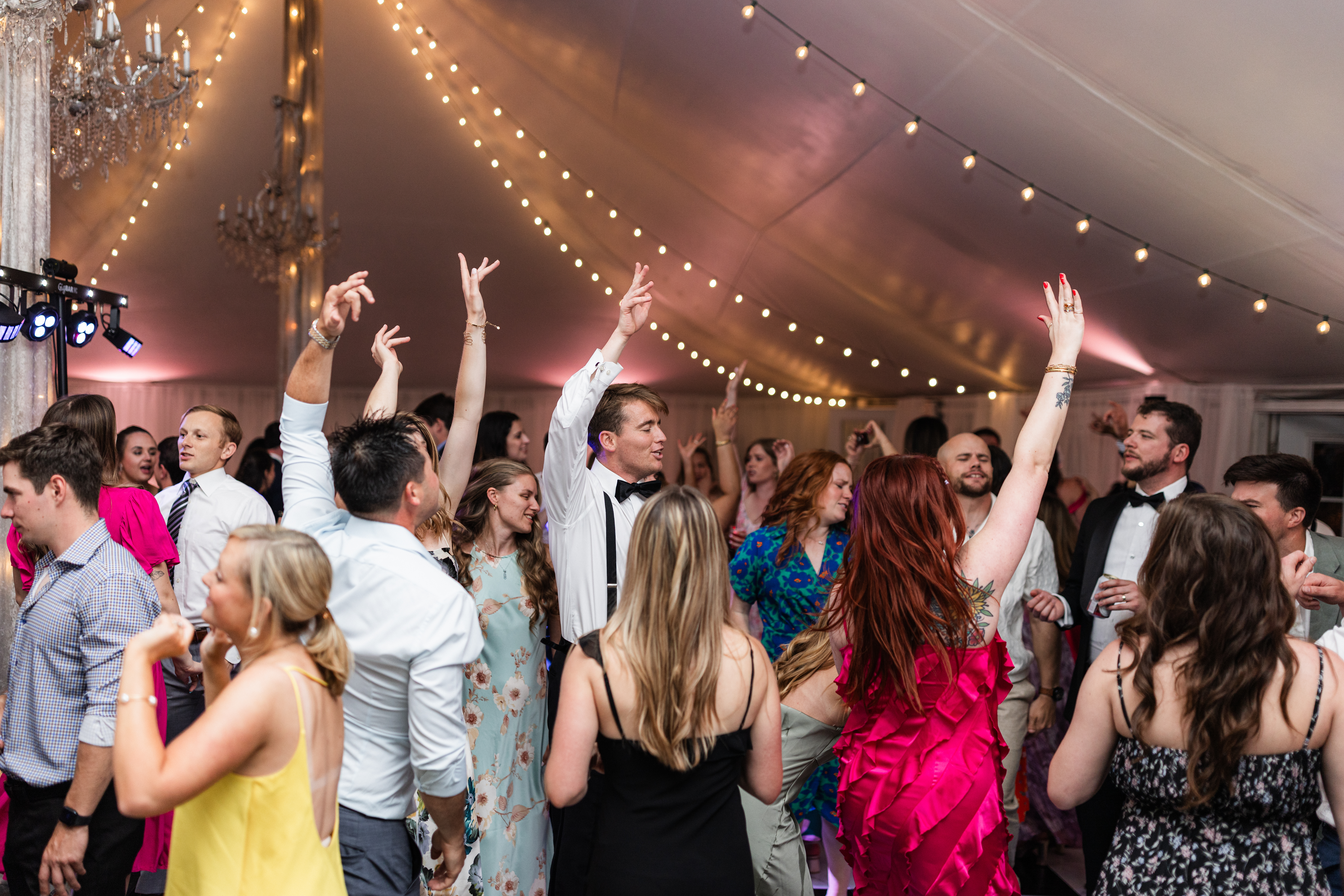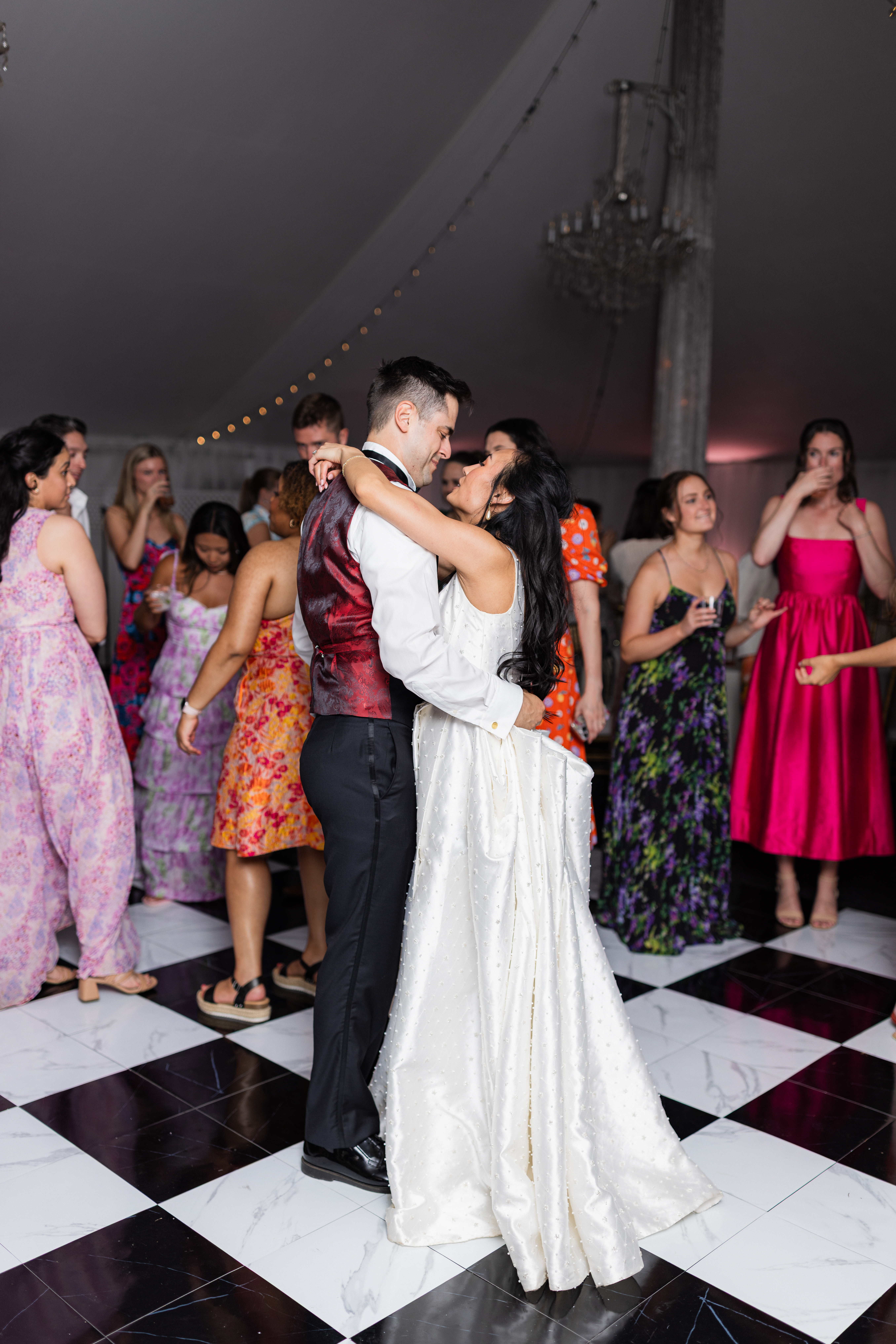 The reception is held in a climate-controlled luxury tent decorated with chandeliers, a checkered dance floor, chiavari chairs, french doors, and uplighting. There is so much the space has to offer and your guests will be ready to celebrate!
