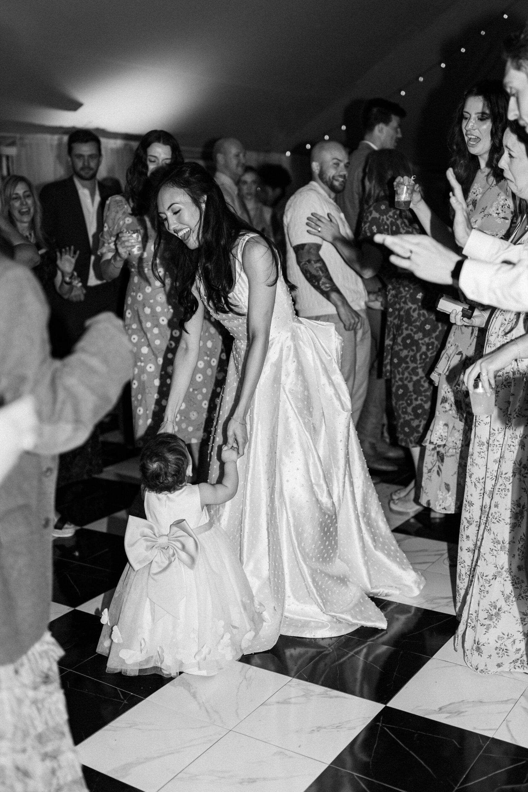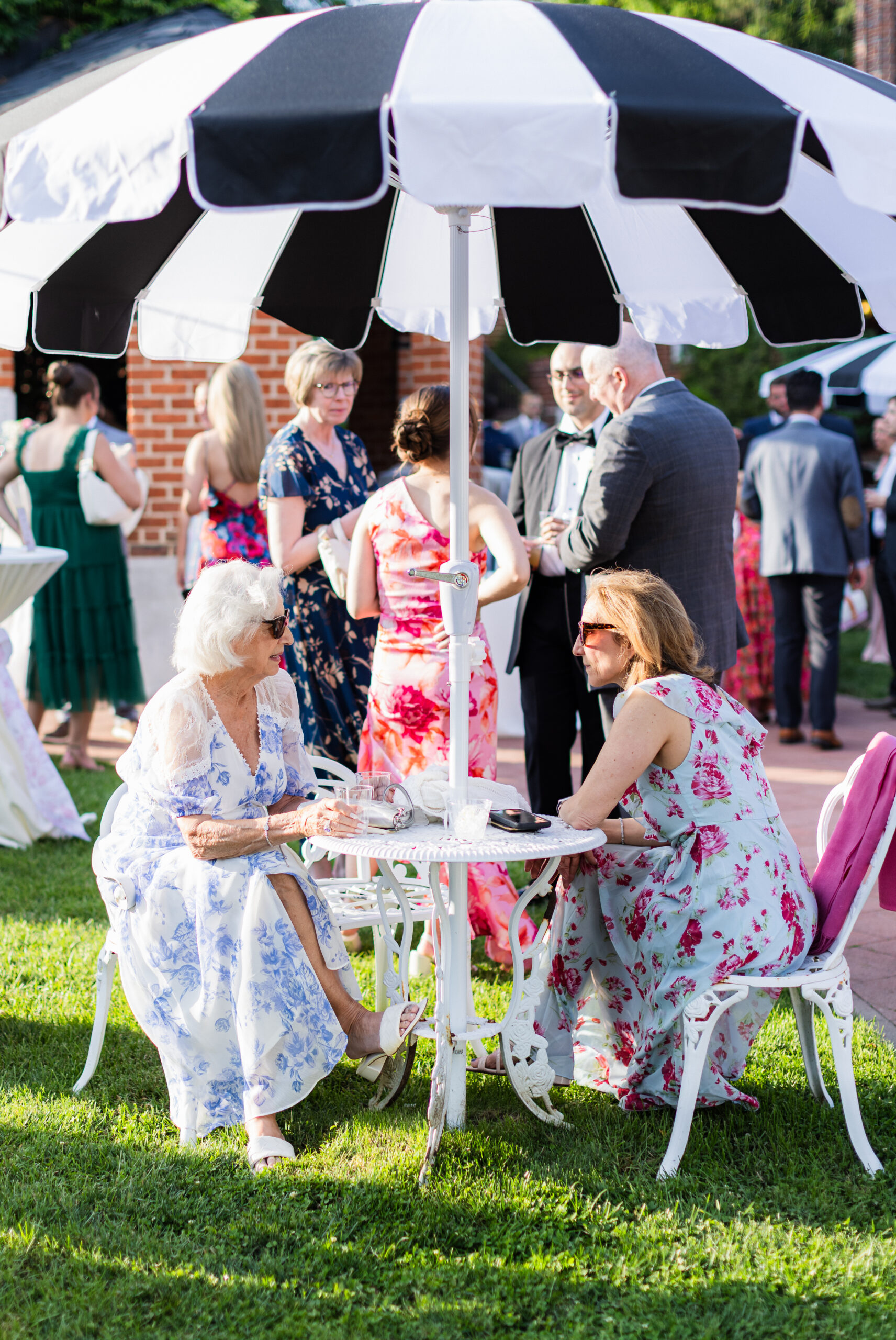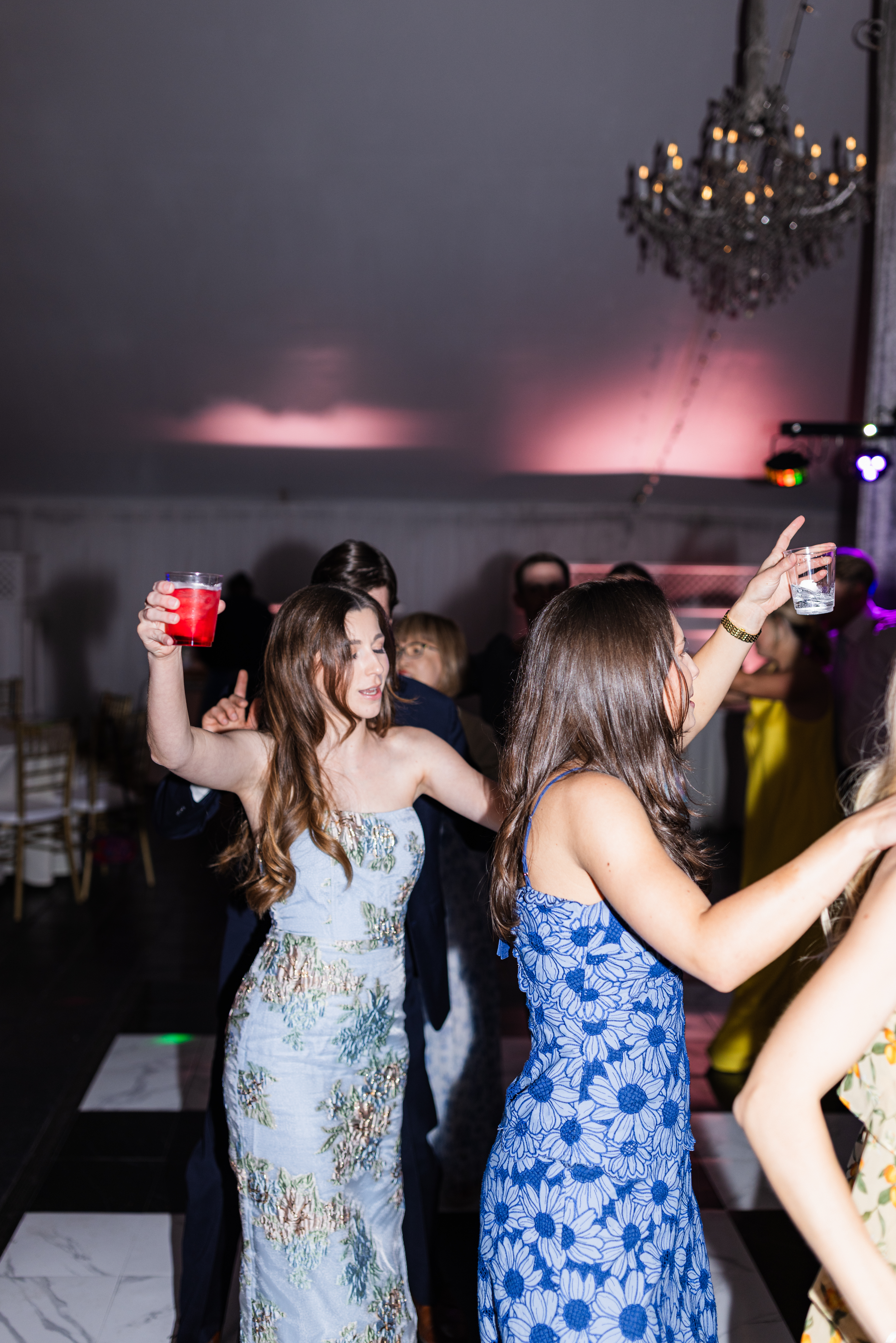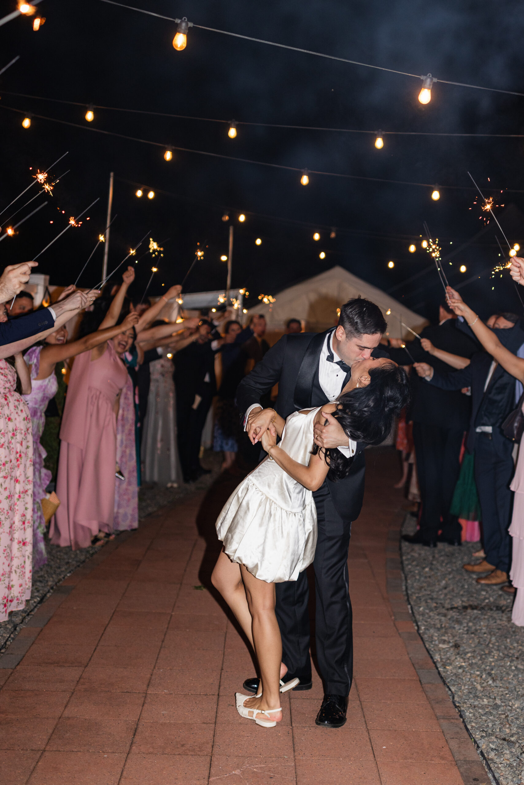 The reception is held in a climate-controlled luxury tent decorated with chandeliers, a checkered dance floor, chiavari chairs, french doors, and uplighting. There is so much the space has to offer and your guests will be ready to celebrate!